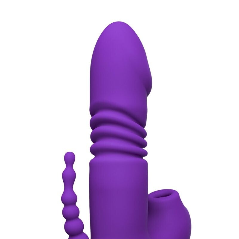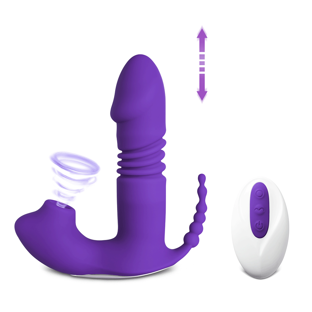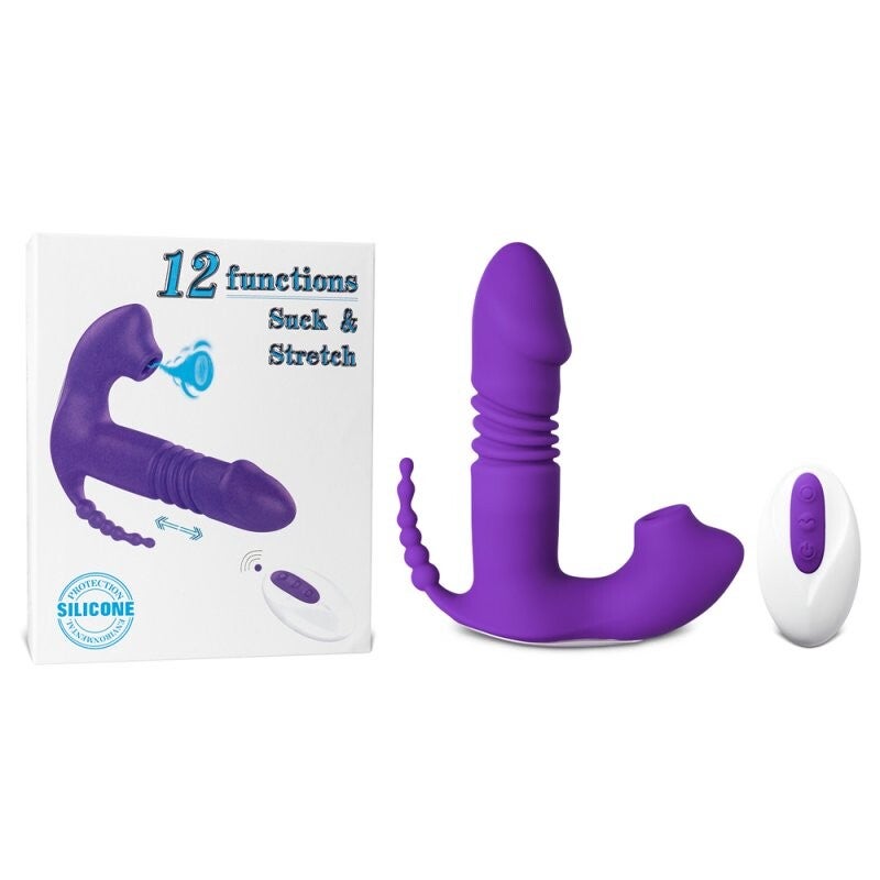 Vibromasseur à poussée en silicone violet avec télécommande à 12 vitesses et fonction de succion.