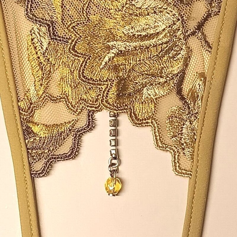 Super sexy ce mini string de luxe ouvert beige avec une belle dentelle fleurie et un bijoux central. Fabrication française En stock. Expédié sous 24 heures.