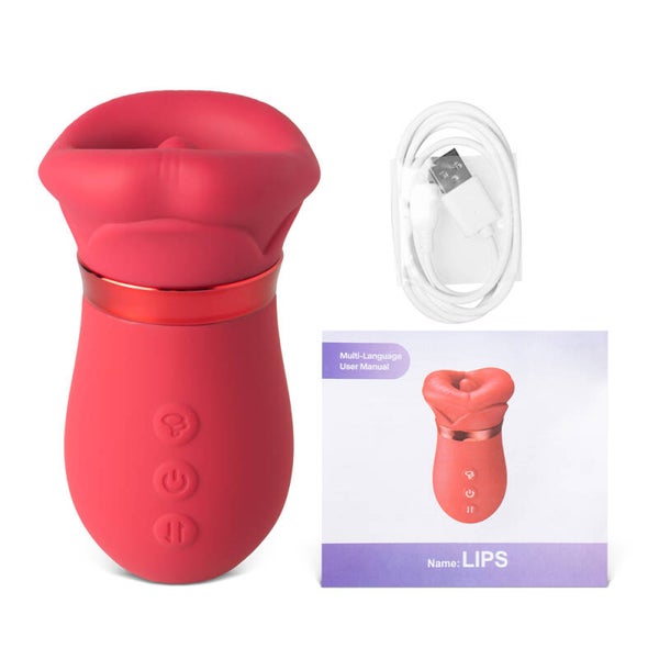 Vibromasseur en silicone médical doux, forme « bouche » rouge, conçu pour stimuler le clitoris et d’autres zones érogènes, rechargeable, 10 niveaux d’intensité, modes de pulsation et de poussée, contrôle via application pour usage local et à distance.