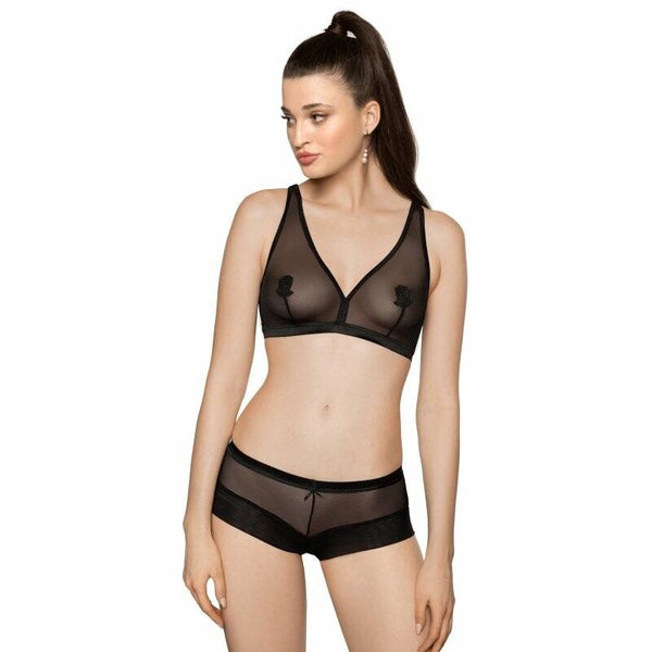 Le devant du slip, orné d’un petit papillon, est en tulle transparent.