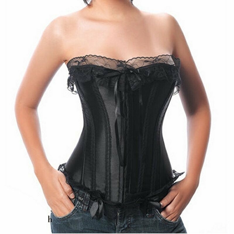 Corset noir, superbe et très sexy avec des noeuds en satin noir, sans jarretelles, une belle dentelle sur le haut.